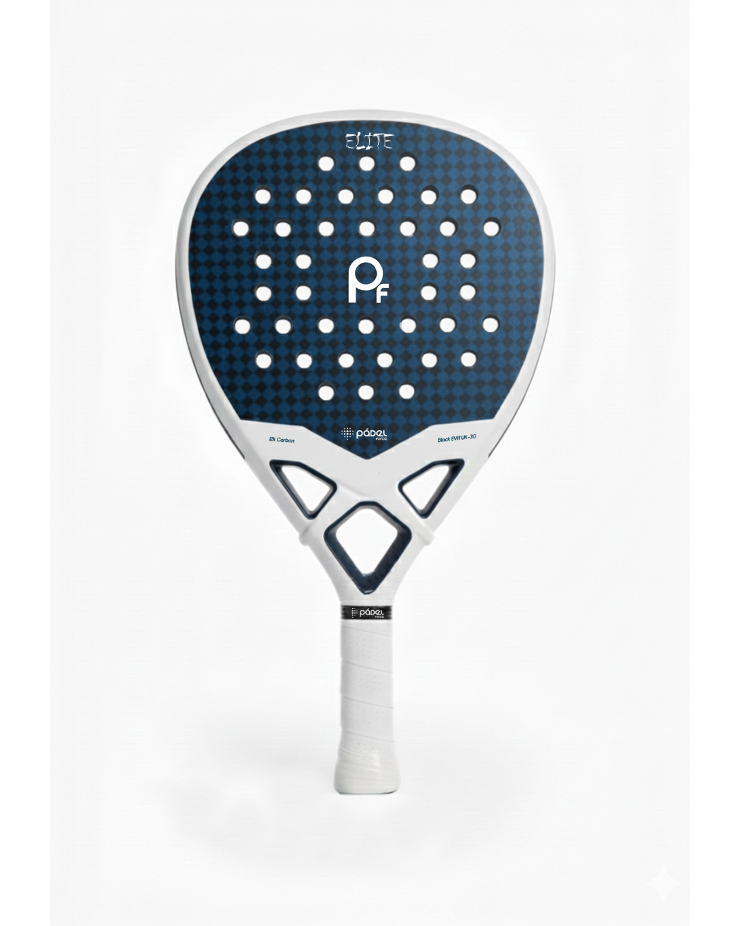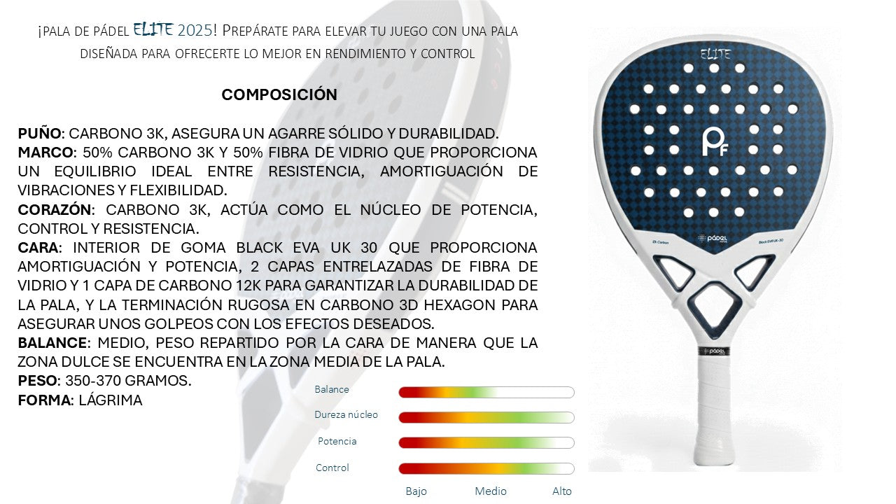 La raquette ELITE est dotée d'une composition intérieure en caoutchouc BLACK EVA UK-30, un caoutchouc semi- dur qui offre de la puissance à la frappe. La composition est complétée par du carbone 3K sur la face, le cœur et le poing, offrant ainsi une excellente adhérence. confèrent à la raquette solidité et durabilité et assurent une puissance déterminante à l'impact.