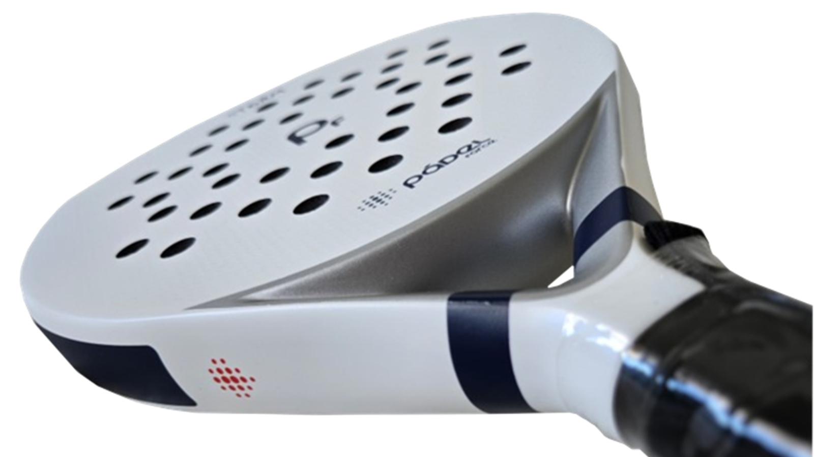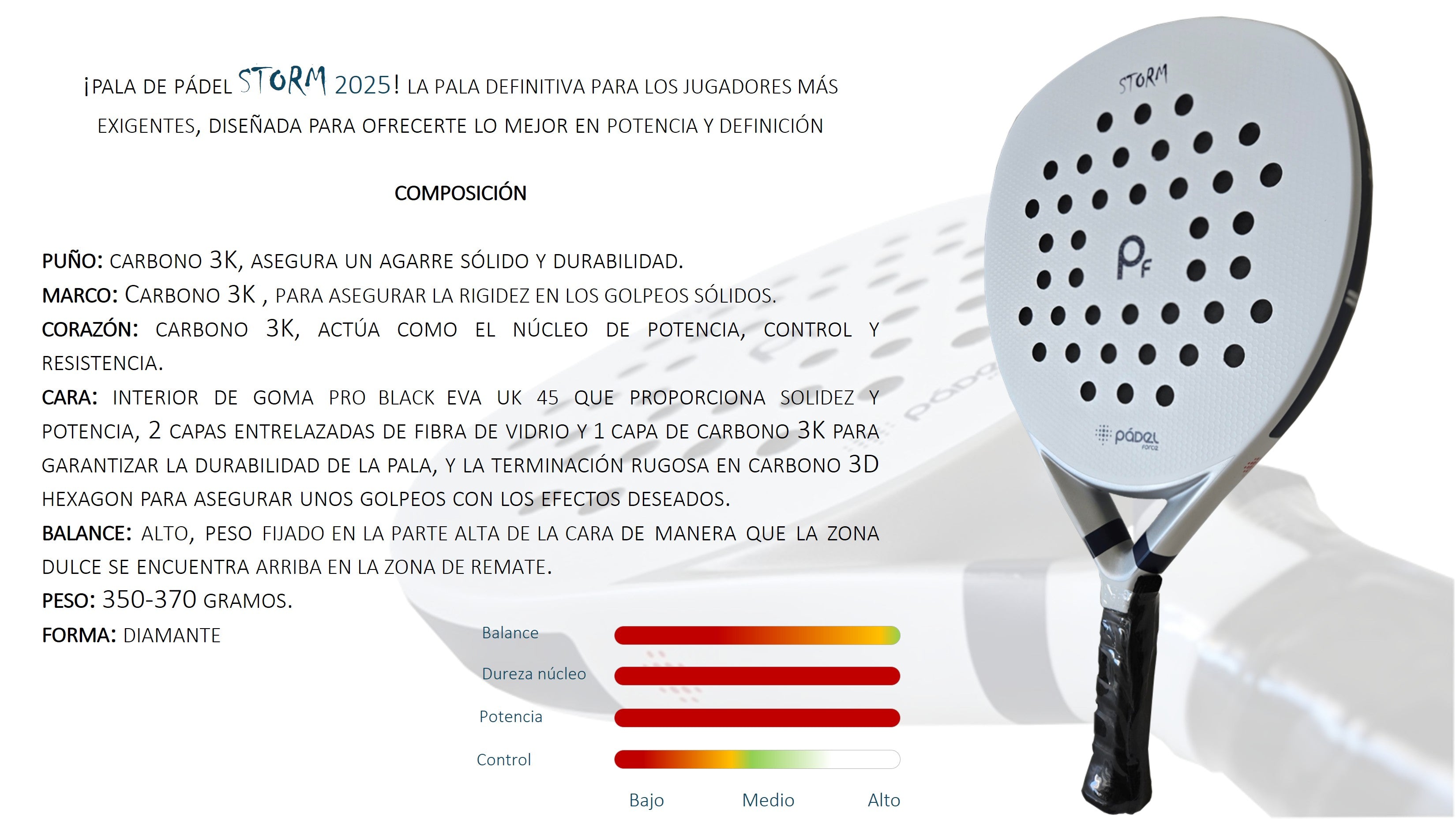 La raquette STORM est dotée d'une composition intérieure et caoutchouc PRO BLACK EVA UK-45, un caoutchouc dur qui offre de la puissance à la frappe. La composition est complétée par du carbone 3K sur la face, le cœur et le poing, offrant ainsi une excellente adhérence.  confèrent à la raquette solidité et durabilité et assurent une puissance déterminante à l'impact.